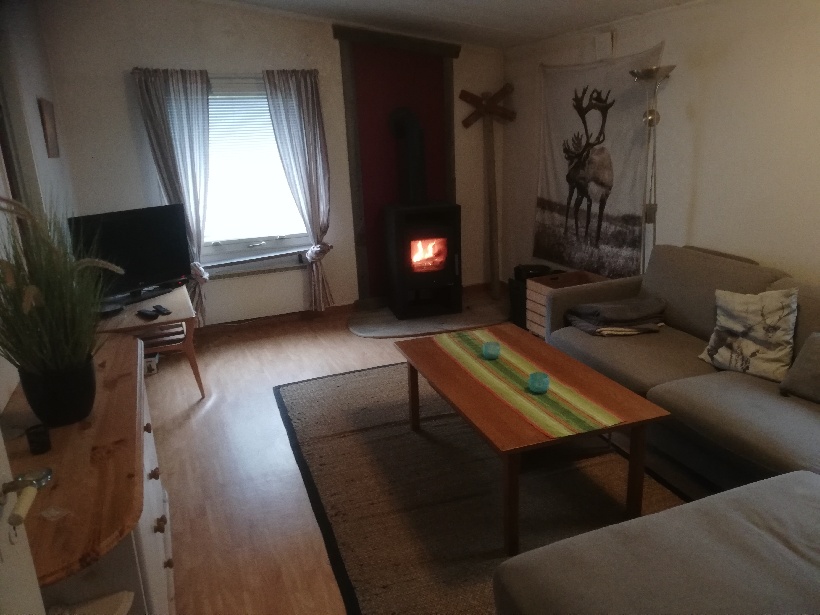 Enplansvilla med: Kök och matrum för 6 personer. Vardagsrum med TV, soffa och braskamin.